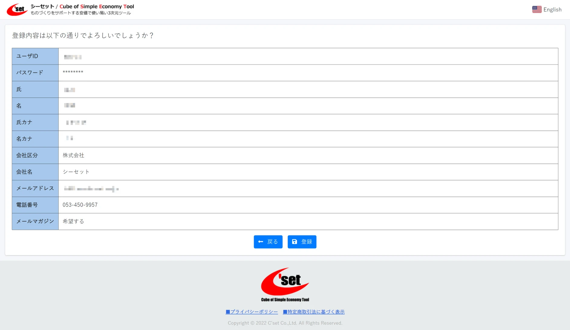 登録内容を確認して[登録]ボタンをクリックします。