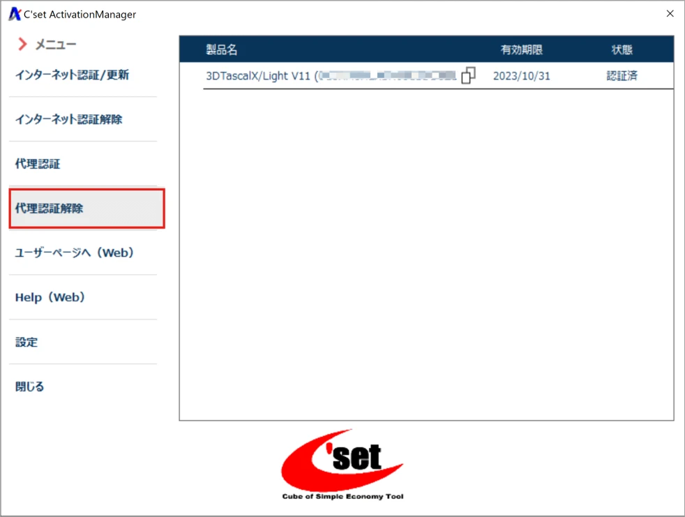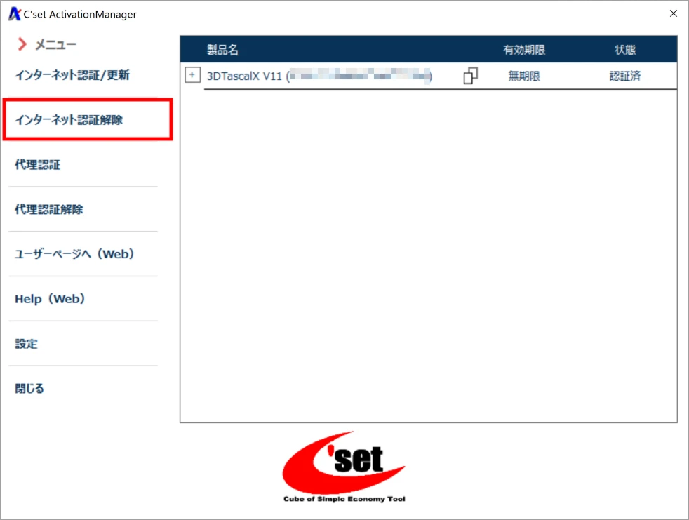 認証解除する製品を選択して[認証解除]ボタンをクリックします。