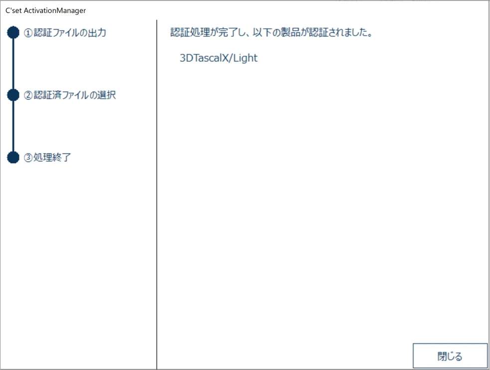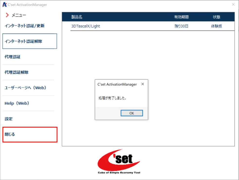 画面左側の[閉じる]をクリックしてアクティベーションマネージャを終了します。以上でライセンス解除は完了しました。