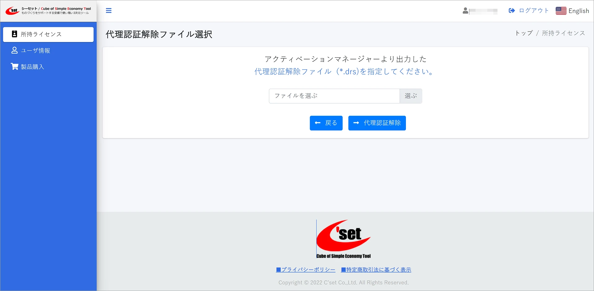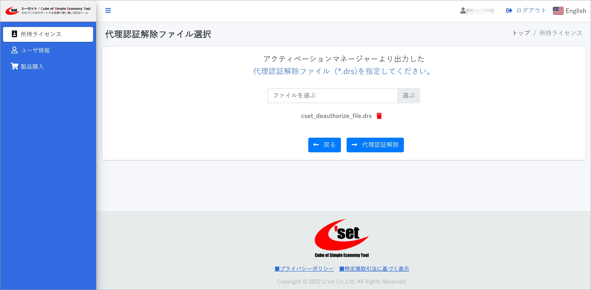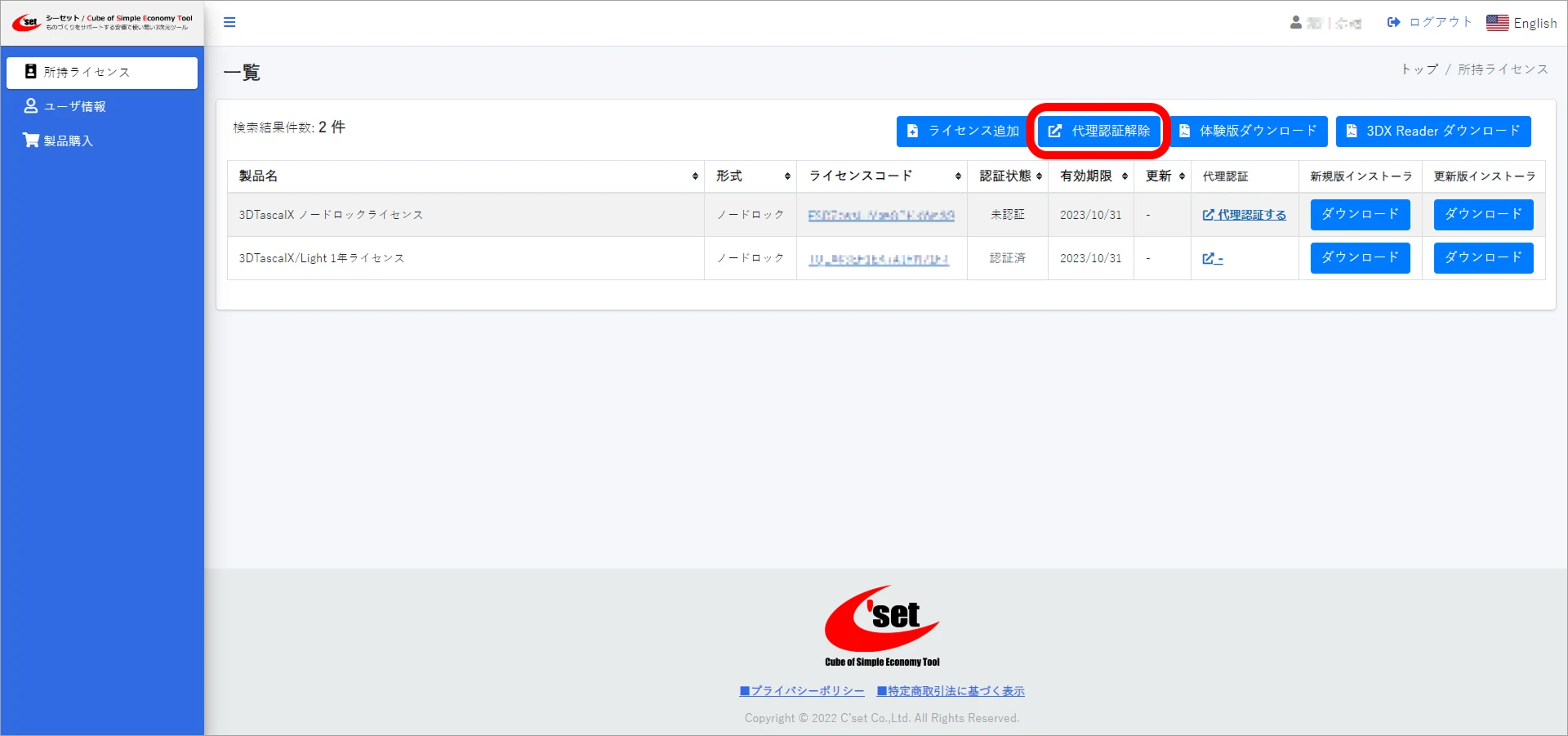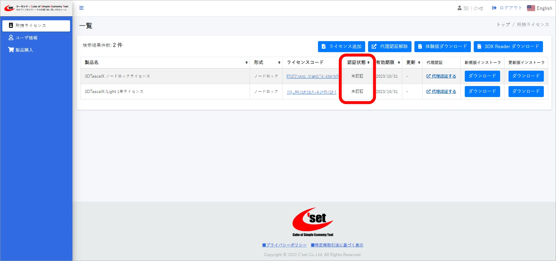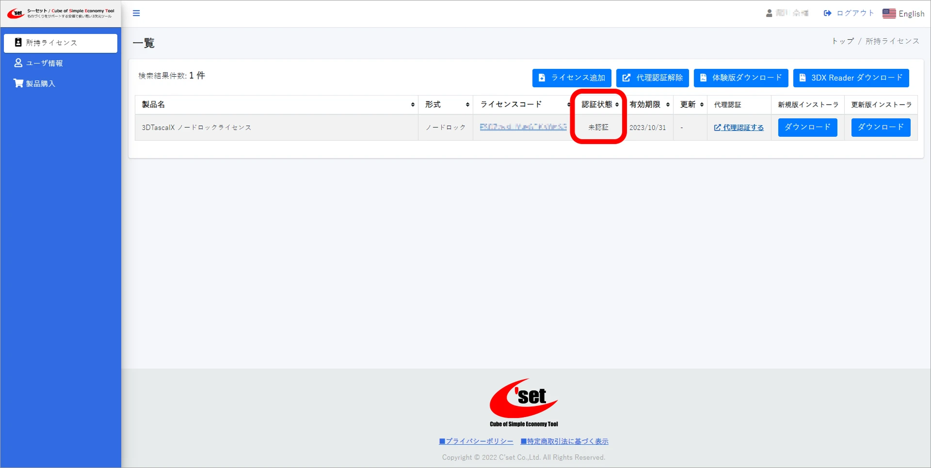 ライセンスコード解除に成功すると、ユーザページの所持ライセンスで認証状態が未認証に切り替わります。