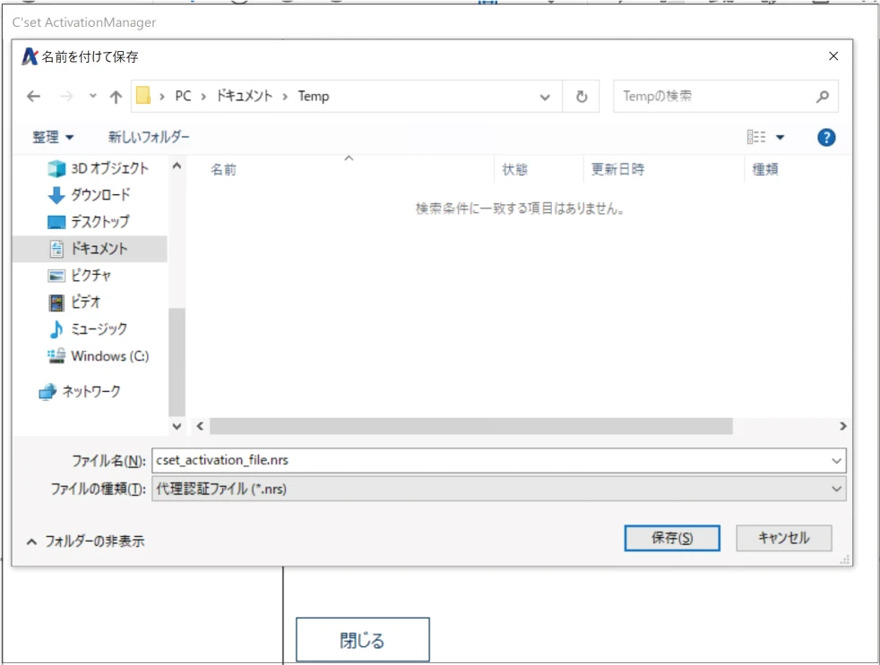 保存する場所を設定し、[cset_activation_file.nrs]ファイルを保存します。
