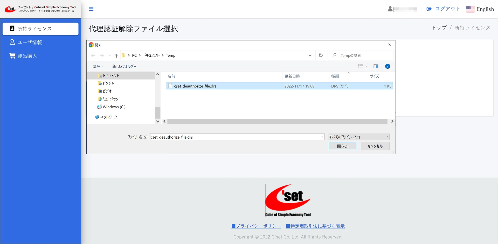 [cset_deauthorize_file.drs]を選択し [開く]ボタンをクリックします。