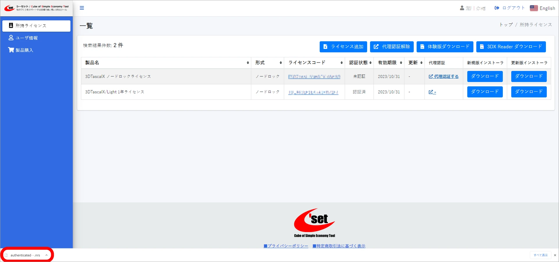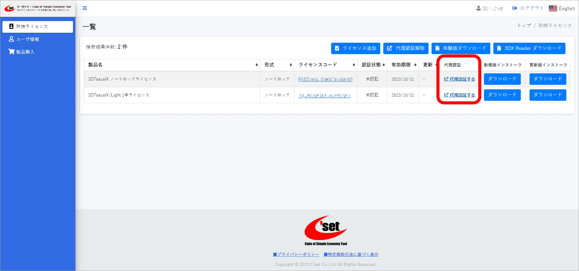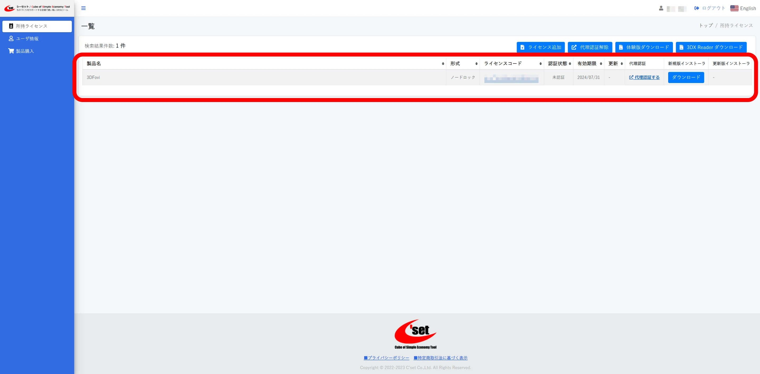 ライセンスコード認証に成功すると、ユーザページの所持ライセンスで認証状態が認証済に切り替わります。