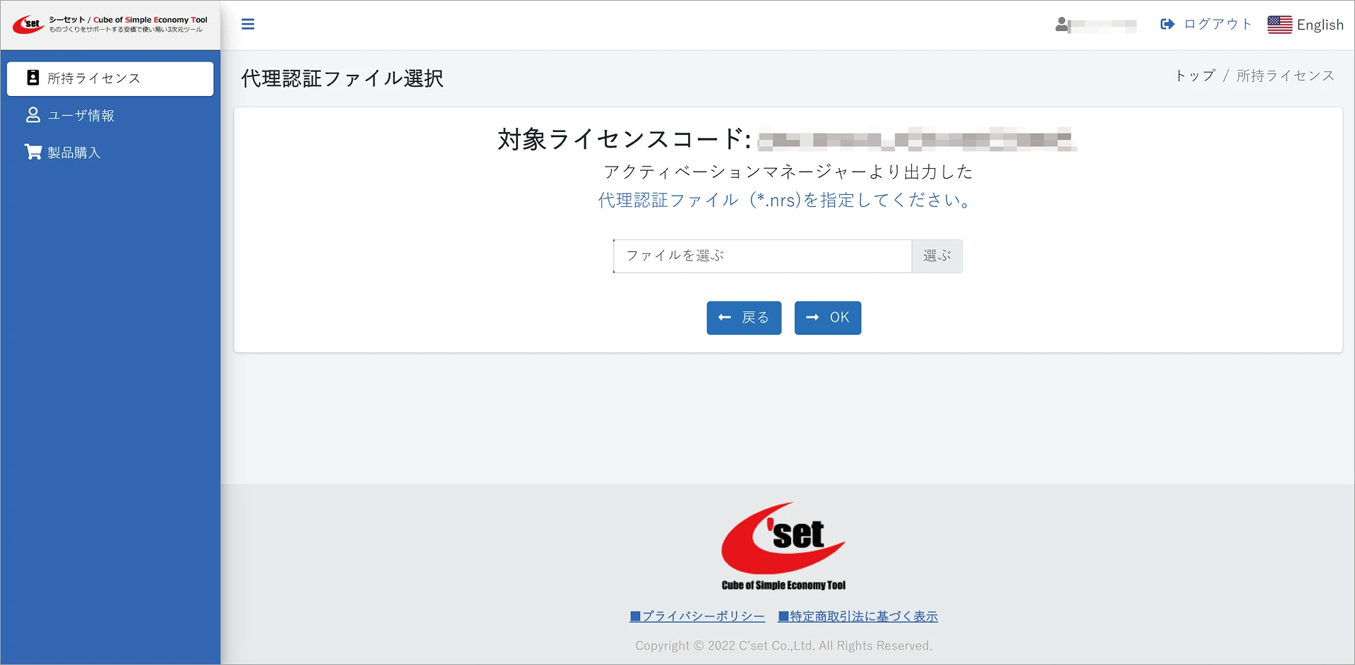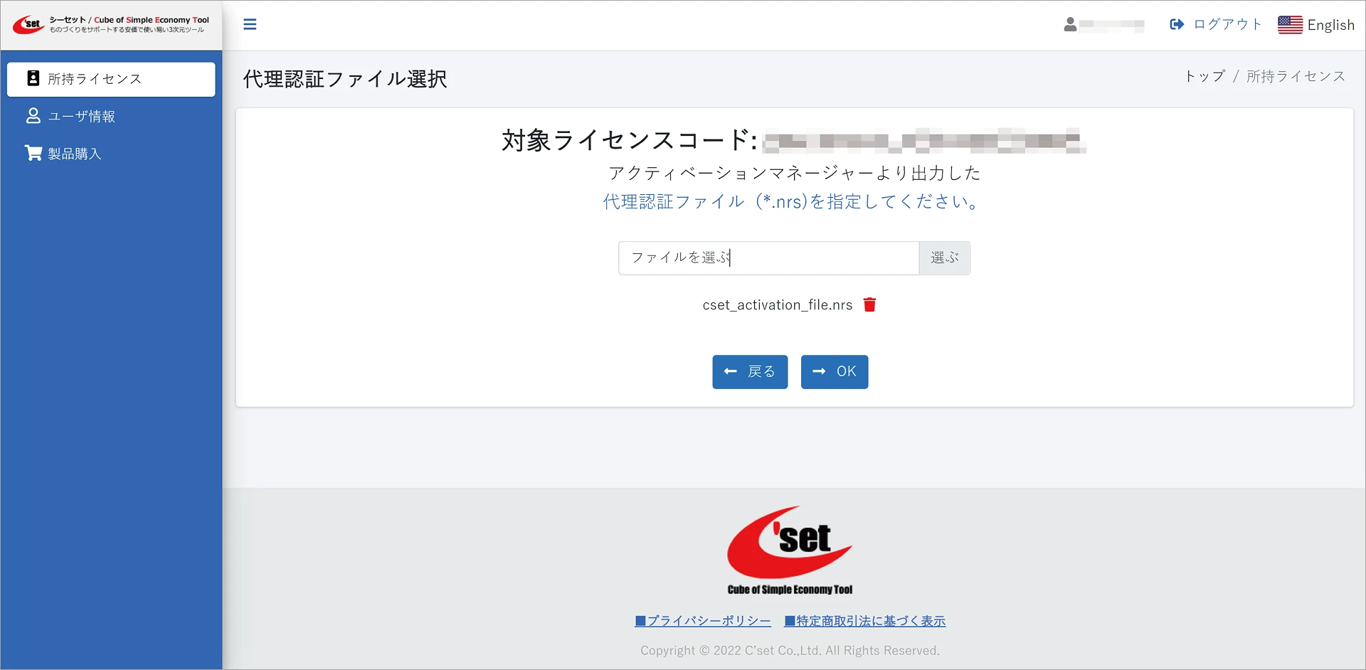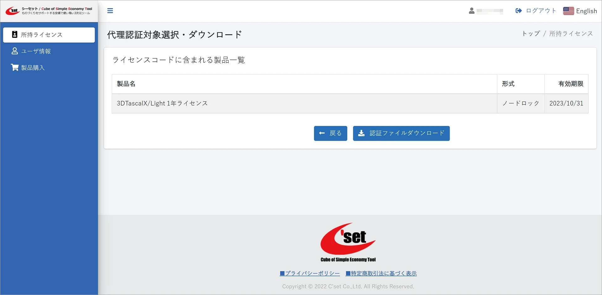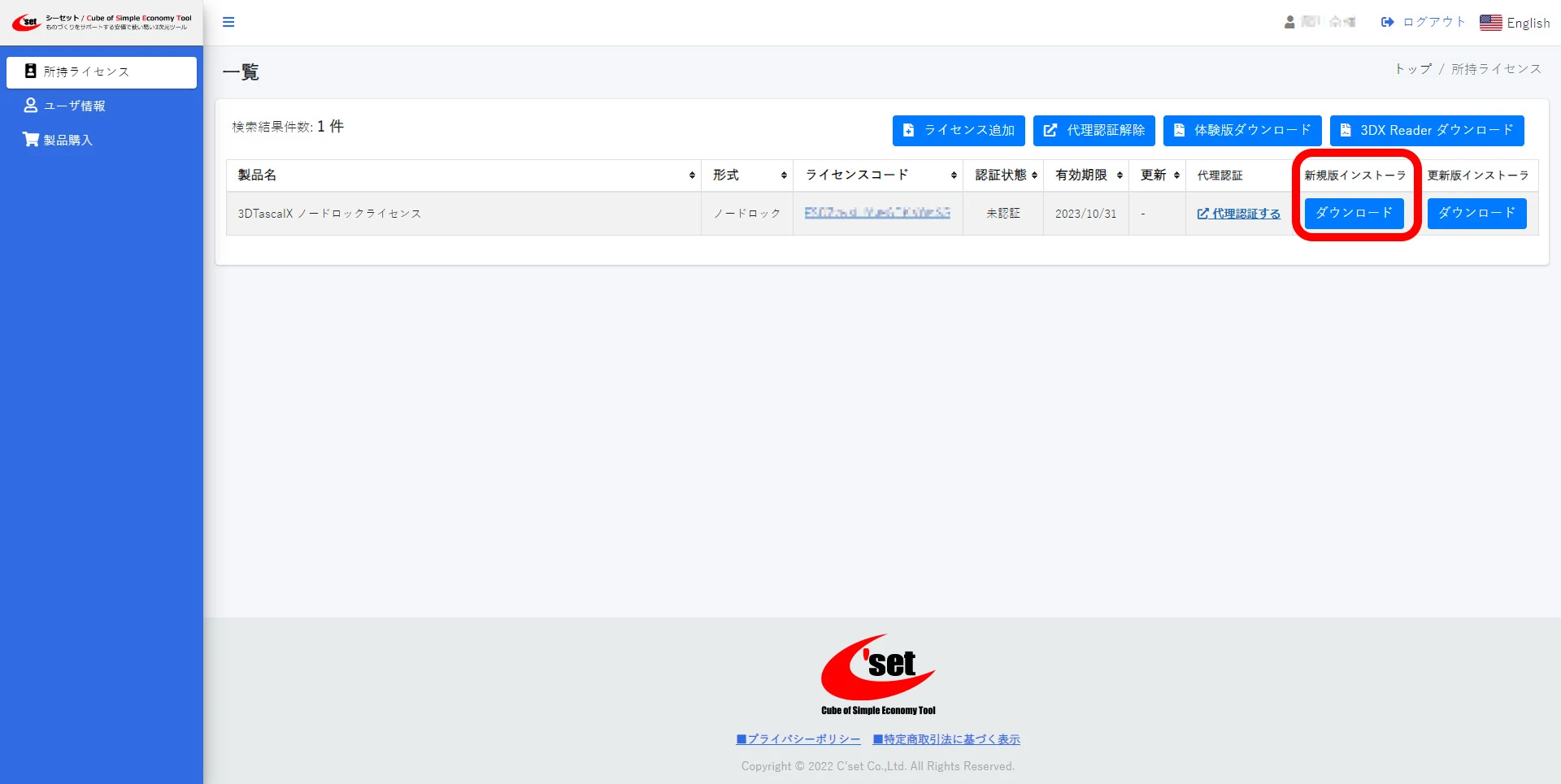 ライセンスコード認証に成功すると、ユーザページの所持ライセンスで認証状態が認証済に切り替わります。