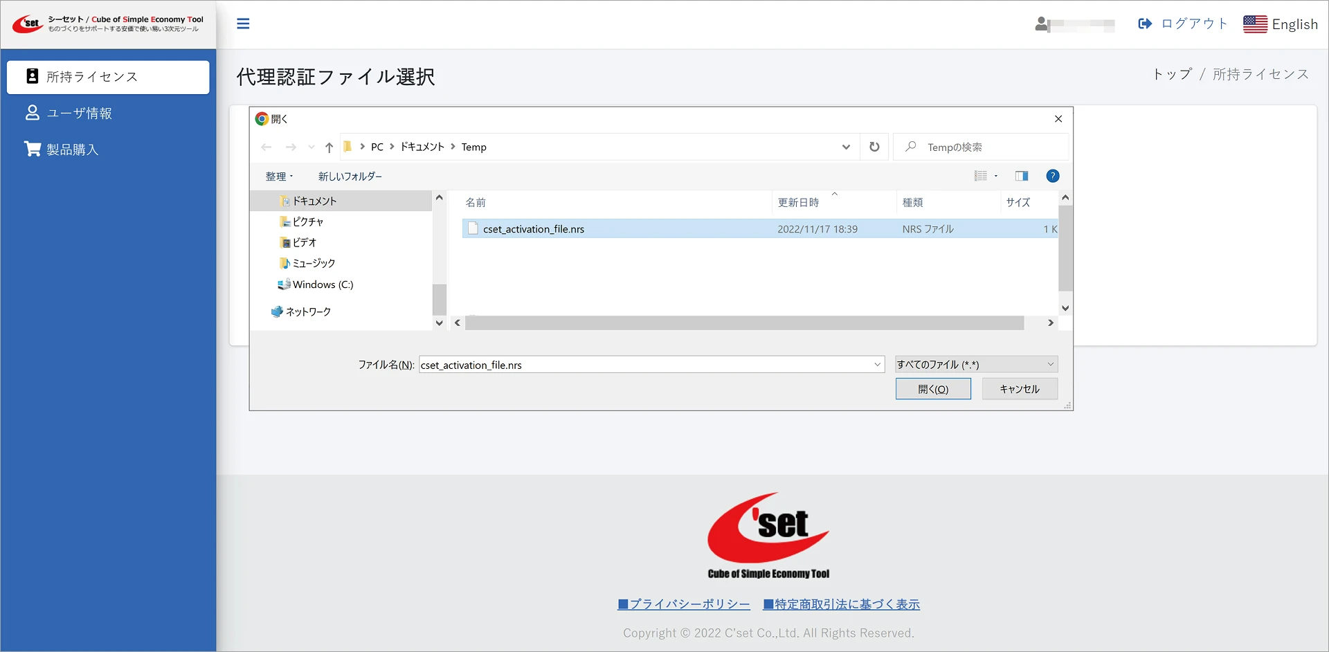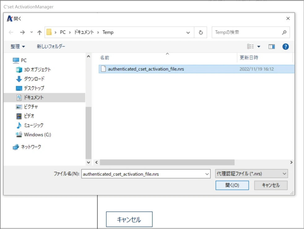 [authenticated_cset_activation_file.nrs]を選択し[開く]ボタンをクリックします。