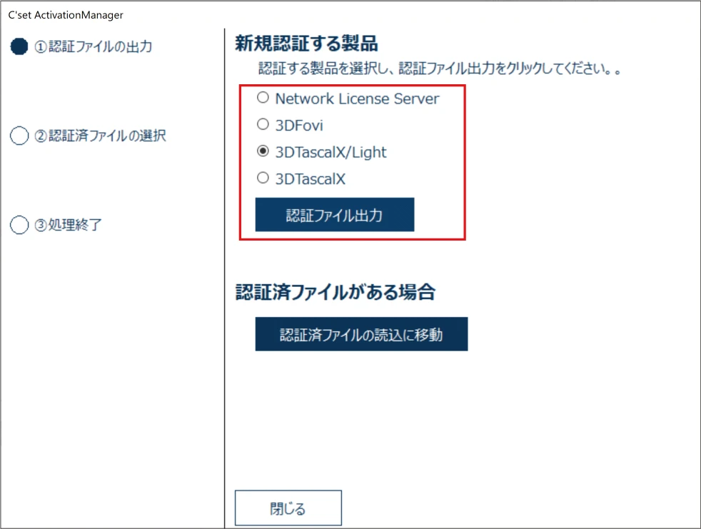 認証する製品を選択して[認証ファイル出力]ボタンをクリックします。