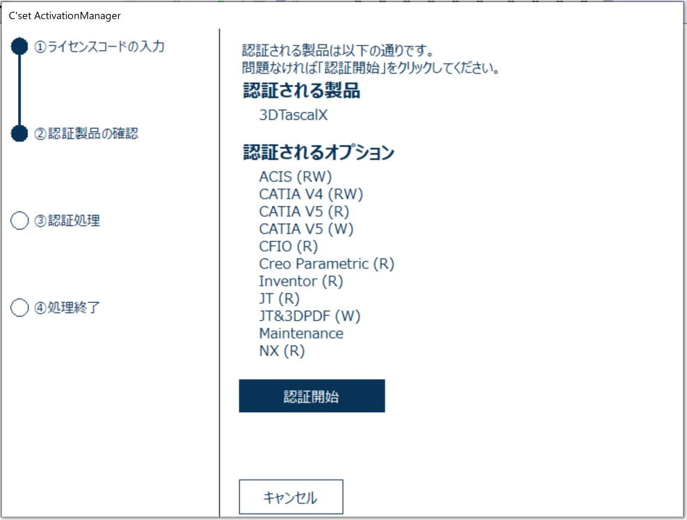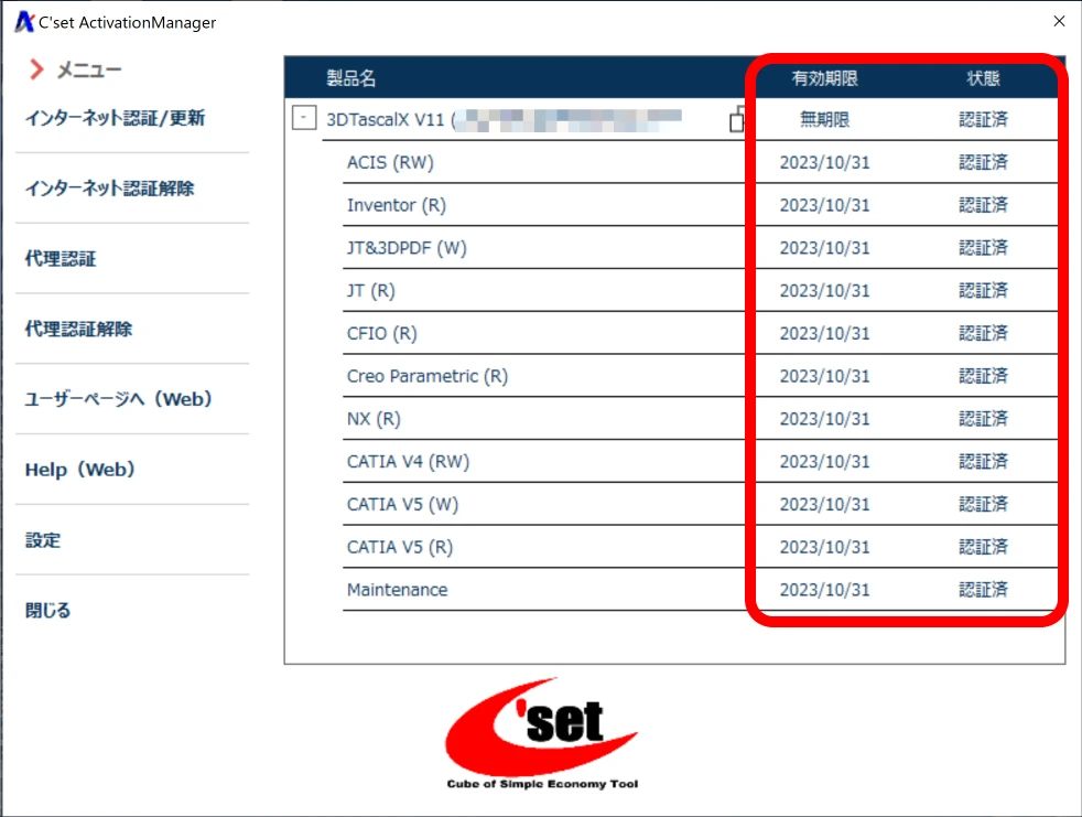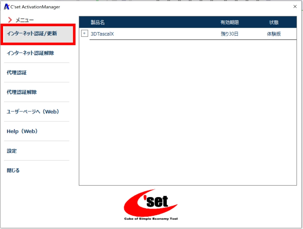 Windowsスタートメニューから[すべて >]/[#]/[3DX**]/[C’set ActivationManager]