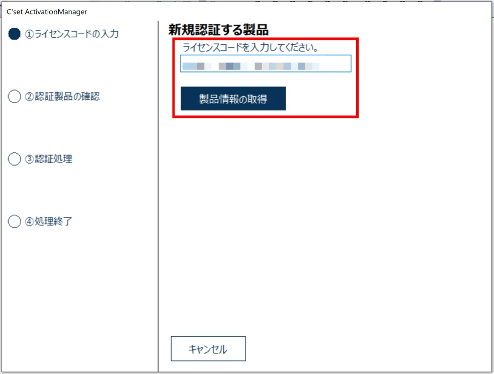 ユーザページから購入した製品のライセンスコードをコピーし アクティベーションマネージャに貼り付けて[製品情報の取得]ボタンをクリックします。