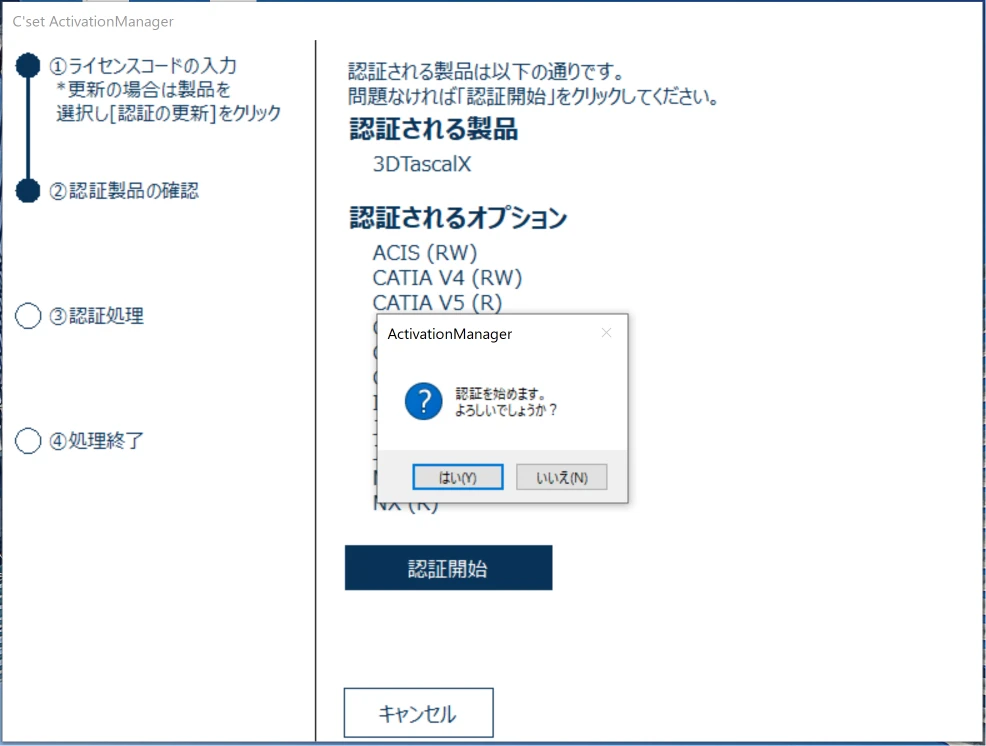 [認証開始]ボタンをクリックします。[はい]ボタンをクリックすると認証処理が開始されます。