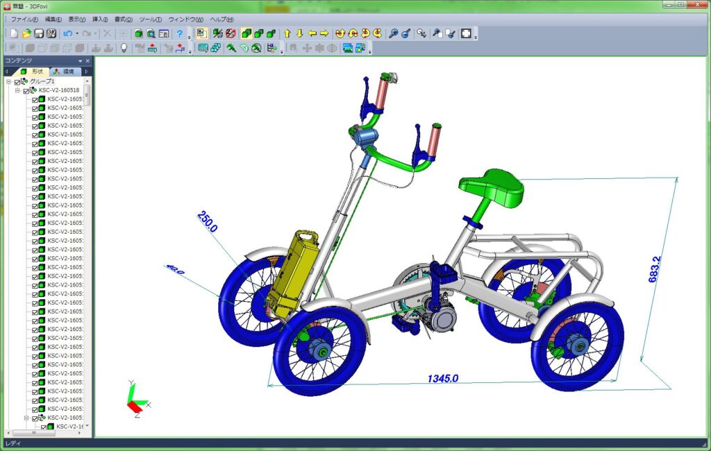 静岡県浜松市に本社を置く株式会社協栄製作所は、主にモーターサイクルや自動車足回り部品の開発から製造・アセンブリまでを一括で行う部品メーカーである。特にアルミを材料とした部品を得意としており、塑形加工、ダイキャスト・鋳造・切削など様々な加工技術で作られた製品は、軽量化による自動車等の燃費向上や、作業者への負荷軽減に効果的だ。 更に、鉄道保全機器や4輪自転車(けんきゃ君 ※図参照)を自社開発しており、メーカーとしての顔も併せ持つ。技術部長の田口靖明氏と、営業部の三上晃宏氏に、「3DFovi」「3DTascalX/Light」を導入した経緯について話を聞いた。
