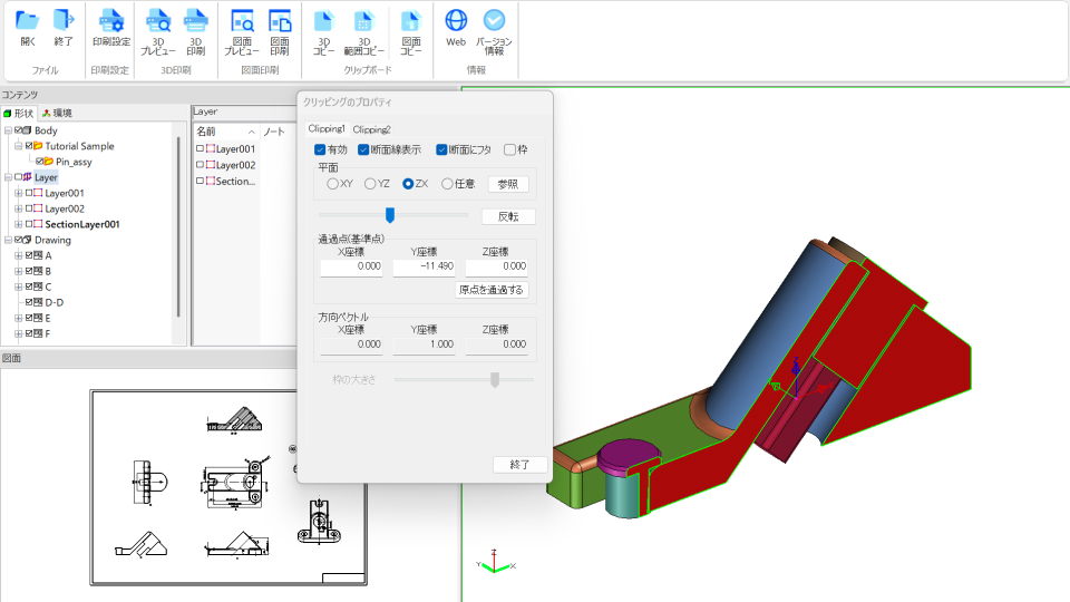 You can view all information added in 3DTascalX, including 3D data, 2D drawings, dimensions, comments, cross sections, and view information.