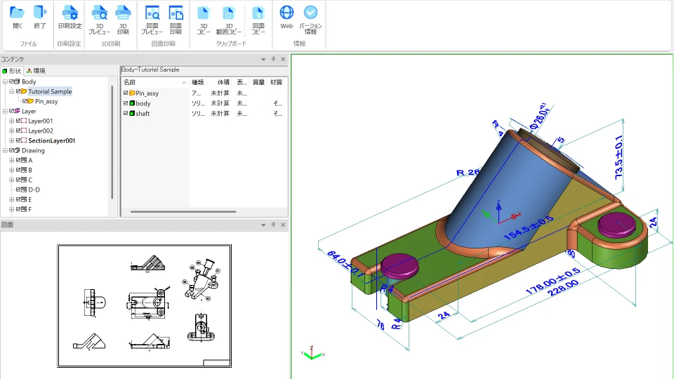 3Dデータはもちろん、2D図面や寸法、コメント、断面やビュー情報など3DTascalXで付加した情報が全て閲覧可能です。